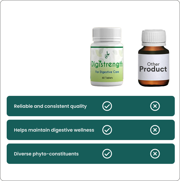Digistrength tablet is a blend of herbs known in relieving dyspepsia, promotes digestion, reduces bloating & heaviness in stomach. This may be helpful in ease of gastrointestinal discomfort by assisting metabolism.