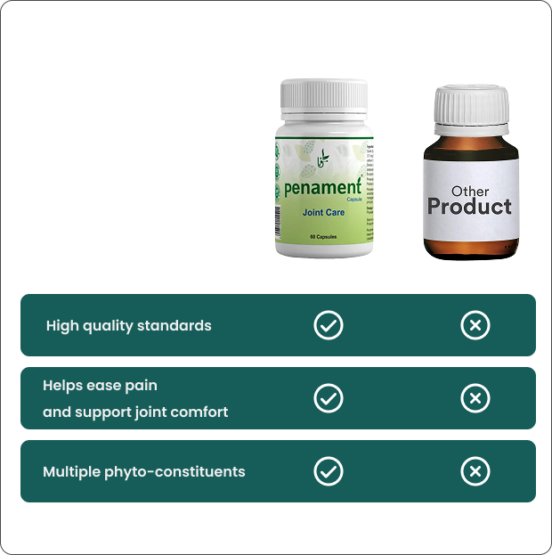 Penament Capsule is a blend of herbs known to have analgesic & anti-inflammatory properties. This may be helpful in pain & sprains management due to injuries, osteoarthritis, back discomfort and joint pain.